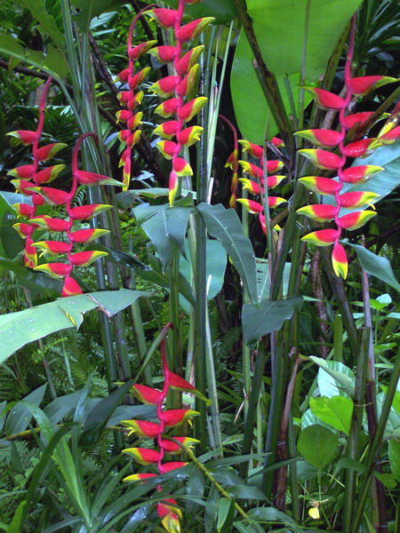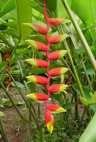 在这炎热的夏日里,当你漫步在姜园,远远望去,你会发现在绿叶丛中悬挂着一串串五彩缤纷的鞭炮,特别引人注目,再近观看,你又会发现其边缘黄绿似鸟喙状艳丽的奇特花型,它就是金嘴蝎尾蕉。