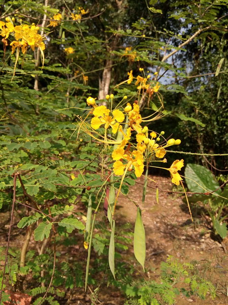 洋金凤(Caesalpinia pulcherrima (L.) Sw.),豆科(Leguminosae)云实属常绿灌木,别名金凤花、蛱蝶花、黄蝴蝶、黄金凤。高可达3米,叶二回羽状复叶,小叶长椭圆形略偏斜,先端圆,微缺,基部圆形。总状花序开阔,顶生或腋生。花瓣圆形具柄,黄色或橙红色,边缘呈波状皱折,有明显爪。荚果近长条形,扁平。花期长,在华南地区可全年开花。