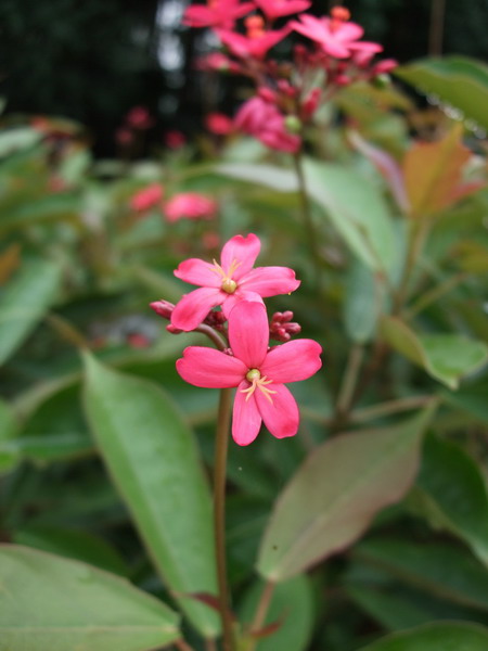日日樱(Jatropha Pandurifolia Andrews),别名:琴叶珊瑚、南洋樱、琴叶樱,为大戟科(Euphorbiaceae)多年生常绿灌木,高1-2米。单叶互生,倒阔披针形,常丛生于枝条顶端。聚伞花序,花冠红色,花瓣5片,为单性花,雌雄同株。雌雄花分别着生于不同的花序上,雌花长在花序的中心,侧生4-6朵雄花,象众星捧月一样。蒴果球形,青绿色转黑褐色。