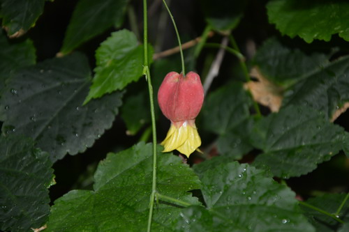 蔓性风铃花(Abutilon megapotamicum)又称为悬风铃花、巴西茼麻、红萼苘麻、灯笼风铃,为锦葵科(Malvaceae)软木质藤蔓状常绿灌木。枝条纤幼细长,分枝很多,叶互生,有细长叶柄,叶心形。花生于叶腋,花梗细长,花下垂,花萼红色,套着花瓣,花瓣黄色,花蕊深棕色,伸出花瓣,花冠形状如风铃,气候适应全年可开花。