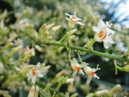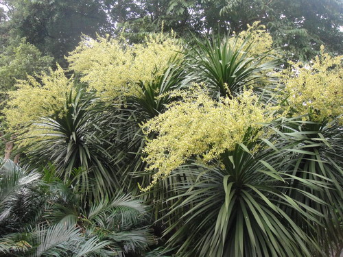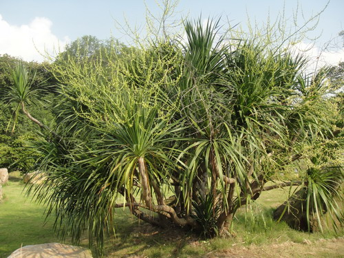 海南龙血树(Dracaena cambodiana Pierre ex Gagnep.),又名不老松,是龙舌兰科常绿灌木,植株高3-4米。树干粗短,树皮灰褐色,纵裂,显得老态龙钟,但枝、叶却十分繁茂,墨绿色的带状叶片聚生于茎和枝顶,几呈套叠状,抱茎,无柄,叶青翠欲滴,生机勃勃,整个树冠非常美丽。圆锥花序长约30cm,花每3~7朵簇生,绿白色或淡黄色,芳香,小小的花瓣晶莹剔透,非常漂亮。