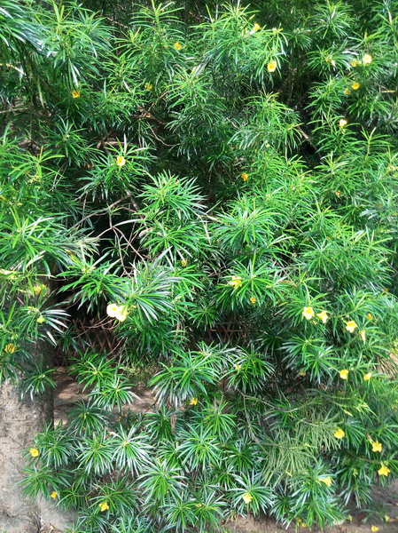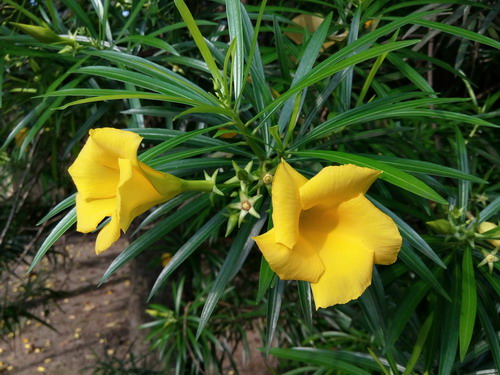 黄花夹竹桃(Thevetia peruviana (Pers.) K. Schum.),是夹竹桃科(Apocynaceae)常绿乔木或小乔木,又名黄花状元竹、黄酒杯花。树高达5米。全株无毛,树皮棕褐色,皮孔明显,枝柔软下垂。全株具丰富白色乳汁。叶互生,羽状脉。顶生聚伞花序或腋生;花大,黄色具香味,花萼5深裂,裂片三角状披针形,内面基部具腺体;花冠漏斗状,裂片阔,花冠筒短,下部圆筒状,花冠筒喉部具被毛的鳞片5枚;雄蕊5枚,着生于花冠筒的喉部,花药与花柱分离;无花盘,子房深裂。核果的内果皮木质坚硬,花期每年5-12月,果期8月至翌年春季。
