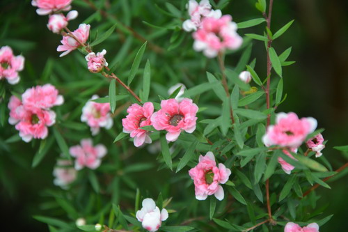 松红梅(Leptospermum scoparium)为桃金娘科(Myrtaceae)常绿小灌木。株高约2米,分枝繁茂,枝条红褐色,较为纤细。叶互生,叶片线状或线状披针形。花有单瓣、重瓣之分。花色有红,粉红,桃红,白等多种颜色。在适宜环境下,花期可长达300天之久,堪称“花界劳模”。