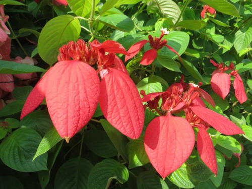 红纸扇(Mussaenda erythrophylla Schumach. & Thonn.)又名血萼花、红叶金花。是茜草科(Rubiaceae)半落叶灌木,株高1-1.5米,叶纸质,披针状椭圆形,叶脉红色。聚伞花序顶生,花冠五角星状,黄色,迷你巧致,有“金花”的美称,可惜细小且易脱落。花期夏、秋季。更具观赏价值的是深红色叶状萼片,如片片红云绽放枝顶,形成“绿叶衬红花”的美景。园林上常配置于林边,草坪周围或小庭院内,颇具野趣,是优良的园林绿化灌木。