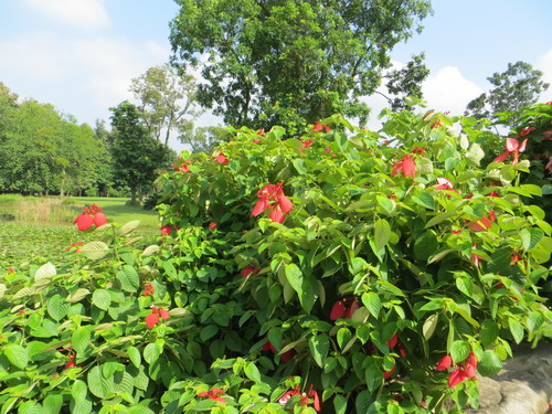在地球上,不仅仅是人类会做五花八门的广告招揽生意,植物为了招蝶引蝶完成传宗接代的重要任务,也会使出浑身解数。由于自身那淡黄色的小小花儿不显眼,丝毫引不起狂蜂浪蝶的兴趣,但又必须依靠这些蜂蝶来传粉,红纸扇唯有想尽办法打出吸引眼球的广告来诱惑蜂蝶的青睐,于是聪明的它将一枚萼片变态为鲜红的叶状,红艳夺目。每当微风拂过,迎风摇曳,轻盈妩媚,舞姿翩翩,煞是好看,终于引得蜂儿忙蝶儿醉!