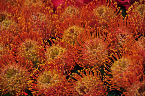 针垫花(Leucospermum sp.)又名风轮花、针包花、针垫山龙眼等,属于山龙眼科针垫花属(Leucospermum)植物。全属植物约50多种,主要分布在南非和津巴布韦等地。常绿蔓性灌木,少数为小乔木,叶轮生,硬质,多为针状、心脏形或矛尖状,边缘或叶尖有锯齿;花序密集,头状花序,单生或少数聚生;花冠小,针状。从它的植物学特征的描述可以看出这种植物有些古老和原始。确实,针垫花是南非本土的植物品种,生长在酸性、贫瘠的土壤环境中,在冬季多雨季节和炎热、干燥的夏季开花。据说,在南非开普角保护区还遗存有世界上为数不多的金黄色针垫花,成为植物王国里不可多得的活化石。如今的针垫花是通过众多的鲜花布景被世界各地的游人认识,从而走出国门,并分布于世界的每一个角落,成为一个非常流行的园艺品种,也被广泛用作鲜切花。