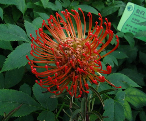 针垫花,形如其名,花朵盛开时像大头针插在球形的针垫上,非常少见,十分美丽。颜色鲜艳夺目,五色缤纷,很是招人喜爱,常见的颜色有红色、黄色、橙色等。其实我们所见到的拳头般大小花球是由无数个小花朵组成的,那伸出的“针头”正是一个个舞动的花蕊。据了解,在南非针垫花开的季节还有一个非常吸引人的景色,那就是无数个围绕在花丛中的小鸟。针垫花不能自花授粉,必须以丰富的花蜜吸引了各种各样的昆虫,而这些昆虫必须穿越密布的“针林”才能享受到甜美的花蜜,而昆虫正是小鸟们猎食的对象。正是这样,针垫花不仅吸引了观花者,同时也吸引了众多观鸟者。