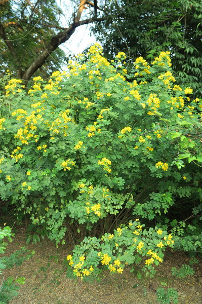 金秋时节,在华南植物园不起眼的角落,会看到一团团正在盛花期的灌木在阳光的映照下显得格外艳丽夺目,走近看翠绿的灌木丛顶上点缀着一簇簇鲜黄色的花朵,给人以愉悦、亮丽、壮观之美,它就是双荚决明。它的荚果常2个一组,悬挂于枝顶,故名双荚决明。