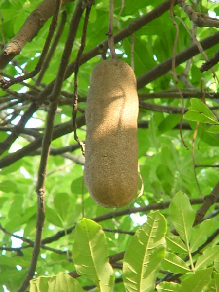 吊瓜树(Kigelia africana (Lam.) Benth.),又名吊灯树、羽叶垂花树。紫葳科乔木。树高可达20米以上。主干粗壮,树冠广圆形。每年春末夏初开花,花桔黄色或褐红色,花大艳丽,成串下垂,宛如一串串风铃在风中摇曳,十分迷人。最让人称奇的是它圆柱状的浆果在秋季成熟,长30-40厘米,粗如碗口,硕大的果实形状各异,一个个形状似大香肠的果实拖着长长的尾巴倒挂枝头,颇为壮观。一株丰产吊瓜树的大树,年产鲜果80-150个,果形硕大,果期长达半年,吊挂枝头,久久不落,立于树下,令人顿有“瓜果满栅迎亲人”之遐想。但令人遗憾的是,吊瓜树的“瓜”不能吃,因其果实木质纤维极多。 现在可以在华南植物园观赏到吊瓜树的果实。