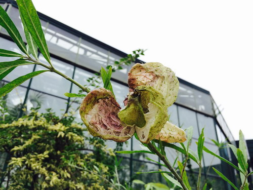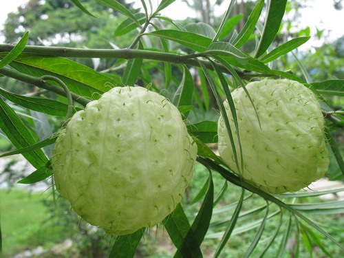 气球果(Gomphocarpus fruticosus (L.) W. T. Aiton),又名河豚果、钉头果、风船唐棉。萝藦科(Asclepiadaceae)亚灌木,高达1.8米。叶片线形,较尖,形似柳叶,表面光滑,叶色浓绿,背面稍淡。花白色至淡黄色。花期极长,每年从秋开到初春。果实黄绿色,卵圆形、圆鼓鼓的,既像是充足了气的气球,又像是正在生气的河豚,所以就有了气球果和河豚果的美称,非常奇特。果内除种子外,中空无果肉,用手轻轻一捏即扁,稍后又复原,很像气球。气球表面有粗毛,似用钉子锤入,所以也叫“钉头果”。果实成熟后能自行爆裂,种子上部附生银白色绒毛,形似降落伞,随风飘到各处播种,故又名“风船唐棉”。
