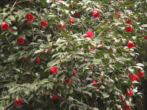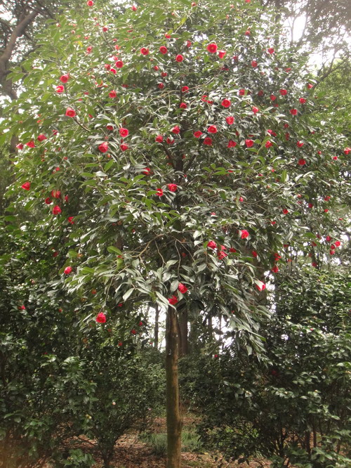 在这寒冬腊月,很多树木都已枯枝落叶,而在华南植物园的山茶园里,各种山茶花竞相绽放,笑傲风霜。这其中有一种树开满喇叭状花朵,鲜红夺目,似热情奔放的少女引来四方游客驻足观赏,啧啧称赞,它就是广宁红花油茶。