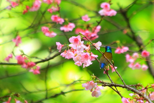 红花高盆樱花与叉尾太阳鸟(雄)