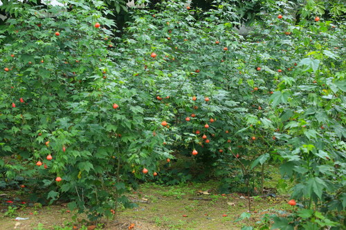 现在正在盛放的纹瓣悬铃花,还有好听的名字——金铃花、风铃花。锦葵科(Malvaceae)常绿灌木。叶掌状3~5深裂。其花腋生,花柄长而细,花冠橙红色,具红色纹脉,瓣端向内弯,似钟形显得美丽而可爱。一朵朵半展开状的花朵挂在柔软的枝条上,如同迎风摇曳的铃铛,倍受人们喜爱。