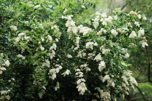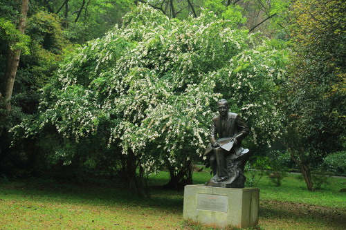 华南植物园中心大草坪旁的科学家雕塑径上,陪伴我国著名植物学家和园艺学家俞德浚先生雕像的是几株山指甲,现它正值盛花期,洋洋洒洒满树白色小花,如雪似霞,静静地守护着俞德浚先生。