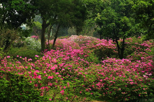 杜鹃盛花时节,花朵密密匝匝,竟相辉映,蔚为壮观,有“木本花卉之王”的美誉,因花开时映得满山皆红而得名。“映山红”是“杜鹃啼血,子归哀鸣”典故的出处。【唐】李白诗云:“蜀国曾闻子规鸟,宣城还见杜鹃花;一叫一回肠一断,三春三月忆三巴”,咏颂杜鹃鸟与花终身不弃的爱恋。【唐】白居易赞杜鹃花:“花中此物似西施,芙蓉芍药皆嫫母;回看桃李都无色,映得芙蓉不是花”,故得“花中西施”之美誉。【宋】杨万里诗云:“何须名苑看春风,一路山花不负侬。日日锦江呈锦样,清溪倒照映山红。”