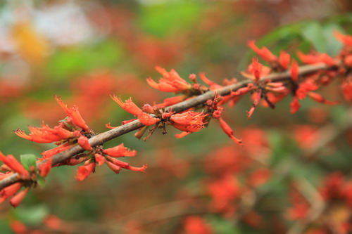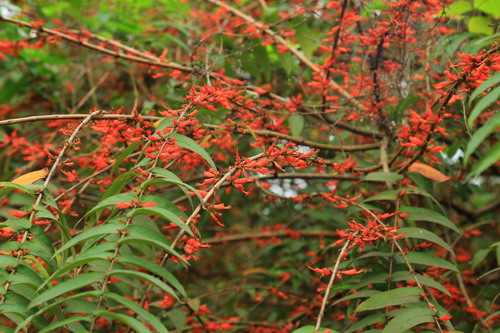 虾子花(Woodfordia fruticosa (L.) Kurz.),又名虾仔花、吴福花,千屈菜科(Lythraceae)灌木。有长而披散的分枝。花萼筒状,鲜红色,口部略偏斜,萼齿之间有小附属体;花瓣6,着生于萼齿间;雄蕊及丝状花柱稍突出于花萼外。花形如小虾,弓着身体,涨红了脸,在风中挥舞着须爪,故名,十分可爱有趣。花期3- 4月。每年开花时,吸引众多鸟儿前来光顾觅食。