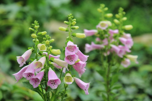 洋地黄不仅花序大气壮观,而且每一朵小花也格外靓丽可爱。你看那花的颜色,桃红、浅紫、奶黄、洁白??各种颜色应有尽有,花瓣上还布满星星点点的黑白斑纹,更为其平添了几分俏丽;再看花朵的形状,如风铃轻悬,又如金钟倒挂,如果摘一朵下来,套在大拇指上把玩,立刻又成了可爱至极的手指帽子。总而言之,无论如何比拟,都是惟妙惟肖,这样的花形,真可谓是有想象力的。