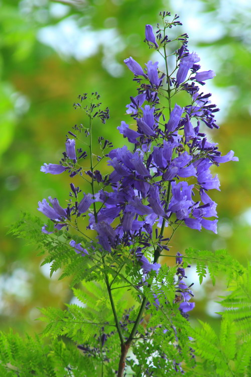 蓝紫色朵朵小花簇傲立枝头,羽状叶片轻盈摇曳。此情此景颇有几分‘紫玉’妆成一树高、万尾羽毛轻飘飘之意境。木本植物中很少开蓝花,高大乔木中开蓝花的就更少,因此蓝花楹更显珍贵。蓝花楹在世界各地广受欢迎,澳大利亚街道两旁种植许多蓝花楹;南非行政首都比勒陀利亚有“蓝花楹之城”的美誉。