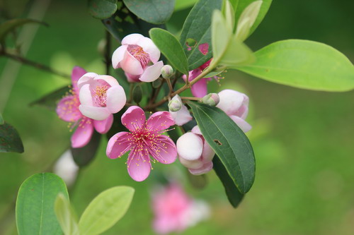 除了果实香醇浓甜外,稔子树的花也甚是好看,五六月间,是稔子开花的季节,那花粉白嫩红,聚拢一堆,样子与桃花很相似,但较之桃花,却少了几分妖娆,多了几分质朴,花并不是很娇艳,但那漫山遍野的一片粉红色,实在令人心醉。稔子的花,花瓣多为五六瓣,中间围着几枚黄色的花蕊,花朵先红后白,红白相间,清丽秀美,边开花边结果,果实一开始是青色的,很小的一个,会慢慢随着成熟就变大,这首童谣便形象地唱出了果子的变化过程:七月半,稔子乌一半,八月中秋,稔子乌溜溜!九月九,稔子甜过酒;十月朝,稔子做柴烧!