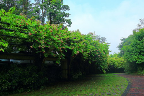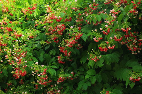 使君子花期夏秋,在广州从5月开始,能一口气开到10到11月之后才慢慢消停,一年有2次以上的盛花期。使君子亦药亦花,不仅是我国的一味传统中药,而且花繁叶茂,轻盈优雅,芳香醉人,在园林应用上是优良的藤架植物或半直立的绿化分隔带植物。