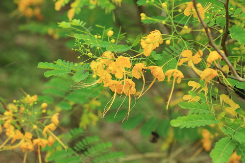 洋金凤(Caesalpinia pulcherrima (L.) Sw.) ,豆科(Leguminosae)云实属常绿灌木,别名金凤花、蛱蝶花、黄蝴蝶、黄金凤。高可达3米,叶二回羽状复叶,小叶长椭圆形略偏斜,先端圆,微缺,基部圆形。总状花序开阔,顶生或腋生。花瓣圆形具柄,黄色或橙红色,边缘呈波状皱折,有明显爪。雄蕊长长伸出于花瓣外。荚果近长条形,扁平。花期长,在华南地区可全年开花。