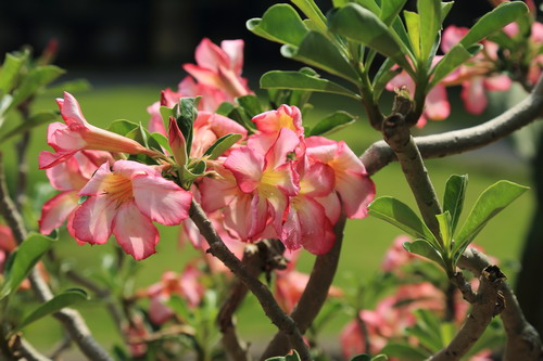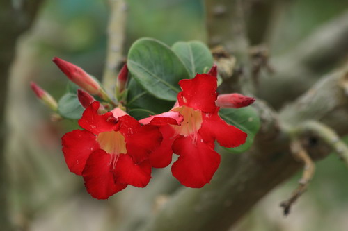 沙漠玫瑰因茎干肉质、富含浆汁,且形状奇特、花大色艳而成为著名的多浆植物之一。树形古朴苍劲,优雅飘逸,叶色翠绿,花朵艳丽,是室内盆栽观赏之佳品。