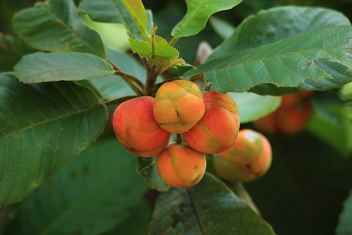 与第伦桃同属的“姐妹”还有大花第伦桃(Dillenia turbinata Finet & Gagnep.),其花期早于第伦桃,于每年3-4月开花,花大,有香气,花瓣黄色,雄蕊呈辐射状。果期6-8月,果球形,暗红色,多汁略带酸味,可作果酱原料。现在正是大花第伦桃果实成熟季节,满树挂满红红的“桃子”,颇为诱人。