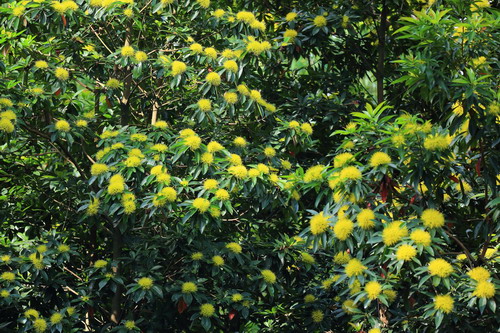 金蒲桃(Xanthostemon chrysanthus (F. Muell.) Benth.),别名黄金熊猫、黄金蒲桃,澳大利亚特有植物。桃金娘科(Myrtaceae)常绿小乔木,叶对生、互生或丛生枝顶,披针形,全缘,革质,叶表光滑,搓揉后有番石榴气味,新叶带有红色。花序呈球状,初开时黄绿色,随后转为黄色,近凋谢时为金黄色。虽说是花,其实其花瓣已退化,只有明显的圆形萼片和花蕊,雌雄蕊长长伸出,丝丝放射,格外别致。全年有花,盛花期为11月到次年2月,果为蒴果。