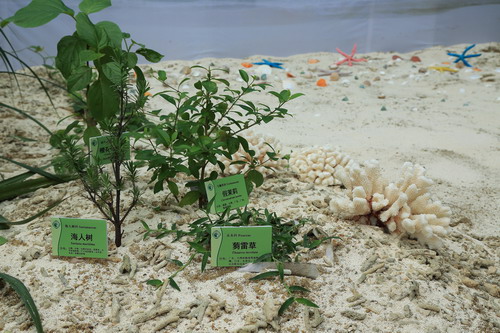 国庆期间,温室群景区还举办“热带珊瑚岛植物展”。热带珊瑚岛为分布在热带海洋中,由海中的珊瑚虫遗骸堆筑的岛屿,我国的南海诸岛,就属于热带珊瑚岛,由200多个岛屿、沙洲、礁滩组成,分为东沙群岛、西沙群岛、中沙群岛和南沙群岛。由于南海诸岛形成的年代较晚,面积小、海拔低,岛上无法形成特优种,植物都是从邻近的大陆和岛屿通过海流、鸟类、风及人类等传播过来,与邻近国家和地区植物区系联系紧密。据统计,陆上植物共有97科400多种。岛上海岸林生长茂密,乔木层可高达20米,优势种有榄仁树、麻风桐、海岸桐、莲叶桐、橙花破布木等,外侧是草海桐、海巴戟、海人树、水芫花等组成的灌木带,最外侧分布着厚藤、海刀豆、海滨大戟、蒭雷草等低矮植物。此次展览共展出热带珊瑚岛上的特色植物18种。