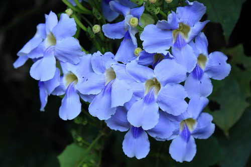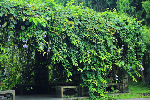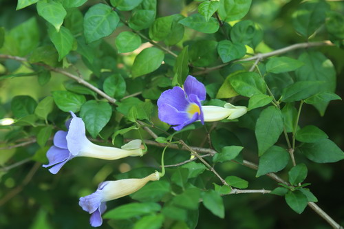 每年的夏秋季,苏铁园入口的凉亭上,大花老鸦嘴成串大朵浅蓝色的花儿垂挂而下,编织成美丽的藤帘,如梦似幻。大花老鸦嘴(Thunbergia grandiflora Roxb.),又名大邓伯花、大花山牵牛、山牵牛,爵床科(Acanthaceae)粗壮木质常绿大藤本,原产孟加拉、泰国、印度、中国,广植于热带和亚热带地区。