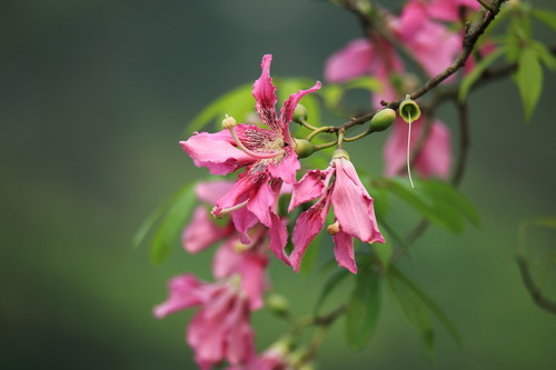 美丽异木棉(Ceiba speciosa (A.St.–Hil.) Ravenna),木棉科落叶大乔木。树干下部膨大,密生圆锥状皮刺。掌状复叶有小叶5—9片。花冠淡紫红色,中心白色;花瓣5枚,卵形,略反卷;花丝合生成雄蕊管。花期8—10月。美丽异木棉花谢后结果,果实有的大的像柚子,一个个如炮弹般倒挂在光秃秃的枝杈上,甚为壮观。果实成熟后,厚厚的外皮自然脱落,一团白色的絮状物脱颖而出,洁白炫目,悬挂在枝头,状如成熟开裂的棉花团,这些絮状物柔软性、保暖性还胜过真正的棉花,用它还可以填充枕头。美丽异木棉原产南美洲,华南植物园于1976年从美国洛杉矶引种并扩大繁殖。目前广植于广东、云南、海南、广西、福建等省区。