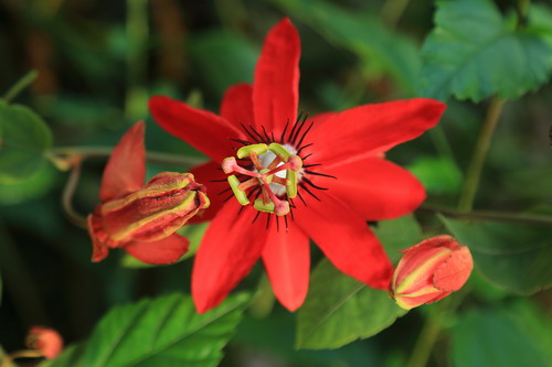 洋红西番莲(Passiflora coccinea Sol. ex Benth.),又名红花西番莲,西番莲科(Passifloraceae)多年生常绿藤本,茎具卷须。叶互生,长卵形,边缘具钝齿。花硕大,形状奇特,呈放射状,极富层次感,色彩艳丽;苞片具腺体,花被片长披针形,红色;副花冠3轮,丝状,外轮紫褐色并散生白色斑点,内两轮稍短,白色。浆果卵圆形。花期秋冬季。原产南美尼加拉瓜、秘鲁等国。