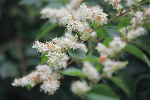 小蜡(Ligustrum sinense Lour.),又名紫甲树、山指甲、水黄杨,木犀科(Oleaceae)半常绿灌木或小乔木。叶对生,纸质或薄革质,卵形、长圆形或披针形。聚伞花序排列成圆锥花序状,花多,细小,芳香;花冠漏斗形,白色。花瓣4枚,花两性,雄蕊2枚,长长伸出花瓣外,招蜂引蝶为其授粉。核果近球形,熟时紫黑色。花期3-6月,果期9-12月。