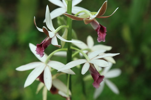 鹤顶兰(Phaius tancarvilleae (L’Hér.) Bl.)为兰科多年生常绿地生草本。植株大型,高7080cm;假鳞茎圆锥状,粗短肥厚、肉质,被鞘;叶26枚,互生,阔长圆状披针形,长3080厘米,宽612厘米,纸质,具纵向折扇状脉。总状花序由假鳞茎基部或叶腋抽出,粗壮直立,高达60110 cm,着花10朵~30余朵,花大,美丽,直径710cm,背面白色,内面暗赭色或棕红色;唇瓣管状,与另外5个花被片巧妙组合,宛如仙鹤展翅飞翔。花被片的背面为白色,唇瓣为红色,因此又被称为花白心红,极富特色。花期春末夏初。