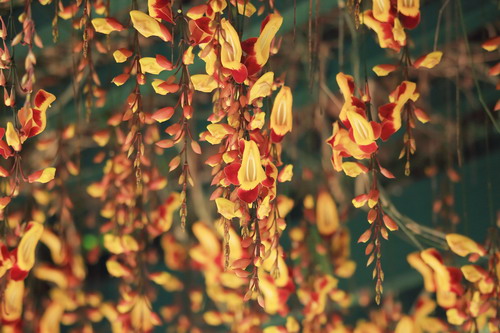 跳舞女郎(Thunbergia mysorensis (Wight) T. Anderson),爵床科(Acanthaceae)常绿藤本观花植物。总状花序,腋生,花序悬垂性,花萼2片,包覆1/3的花冠,花冠尖锄状,花冠内侧鲜黄色,外缘紫红色,连接成裙状,裂片反卷,宛如张开待食的鸦嘴,惟妙惟肖,所以她又有一个通俗的名字“黄花老鸦嘴”。
