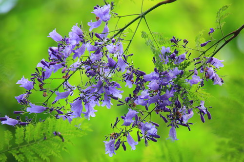 蓝紫色朵朵小花簇傲立枝头,羽状叶片轻盈摇曳。此情此景颇有几分‘紫玉’妆成一树高、万尾羽毛轻飘飘之意境。木本植物中很少开蓝花,高大乔木中开蓝花的就更少,因此蓝花楹更显珍贵。蓝花楹在世界各地广受欢迎,澳大利亚街道两旁种植许多蓝花楹;南非行政首都比勒陀利亚也种植许多蓝花楹,整个城市在春天似乎都变成蓝紫色,因此有“蓝花楹之城”的美名。