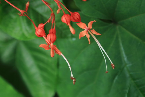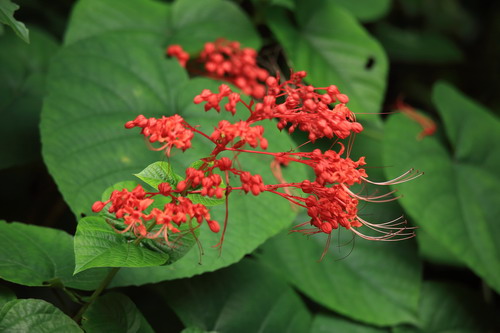 状元红(Clerodendrum japonicum (Tunb.) Sweet)又名赪桐、百日红,是马鞭草科(Verbenaceae)落叶灌木,株高1-2米。深绿色的叶子对生,呈大大的心形,纸质,触之有臭气。花红色,具有芳香,为总状圆锥花序,顶生,向一侧偏斜;花萼细小,漏斗形;花冠红色,雄蕊长长地伸出花冠外,并且向上卷翘。花梗、花萼、花冠、花药、花丝均为鲜艳的深红色,着生花朵的茎秆也是红色,在绿叶的衬托下绚丽而娇艳,美不胜收。果实椭圆状球形,蓝紫色。花果期5-12月。
