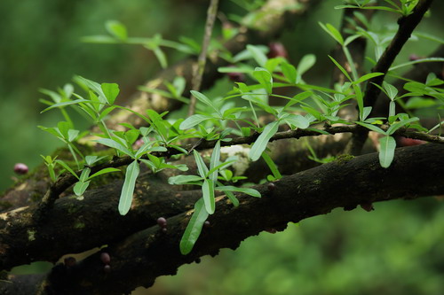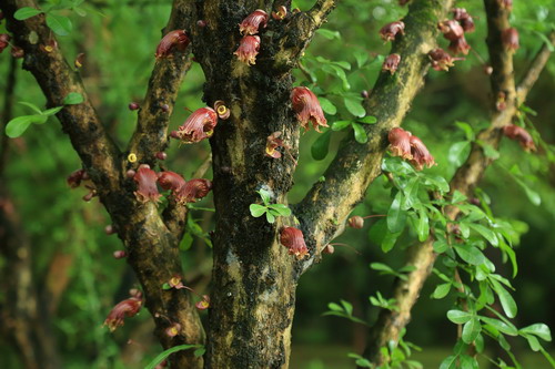 一般的植物是在一、二年生的枝上开花结果,但叉叶木是典型的“老茎生花”植物,在老茎、树干上开花结果。为什么会这样呢?叉叶木原产于南美热带地区,在南美茂密的热带雨林中,叉叶木属于中下层树种,在老茎上开花结果可以方便昆虫为其传粉,还可以躲过狂风暴雨的袭击,有利于繁衍后代;此外其粗壮的树干也能承受果实和大量种子的重压。老茎开花、结果都是植物在进化中逐渐适应生活环境而形成的现象。