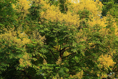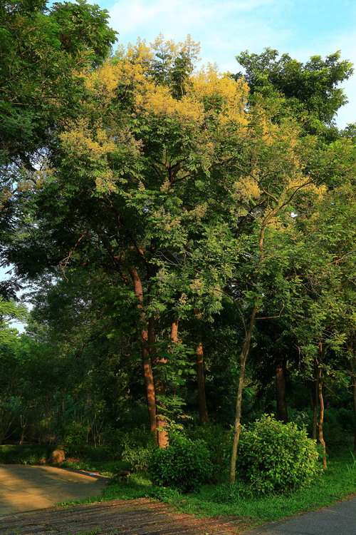 每年国庆前后,华南植物园木本花卉区有一种植物总能感知到节日的到来,树上“张灯结彩”,欢天喜地,一派节日气氛,别提有多应景!它就是复羽叶栾树,因在国庆前后盛开,故又叫国庆树。花开时节,花果同挂枝头,满树金黄色小花,鲜红色膜质果皮膨大如小灯笼,成串挂在枝顶,因此复羽叶栾树又有“灯笼树”、“摇钱树”的形象别称。
