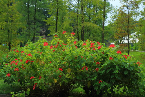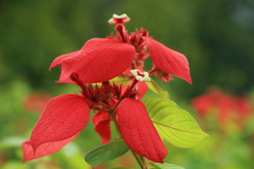 红纸扇(红玉叶金花)观赏地点:生物园入口(紫薇小卖部旁)、温室群景区、棕榈园等地