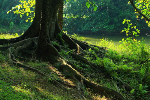 枕果榕树形高大,为支撑其高大的树干和茂盛的树冠,它的根系尽量向土表四周延伸、扩张,形成地面根。而且这些地面根相互愈合成为网状,以固着植株又阻止其他植物对其领地的入侵。