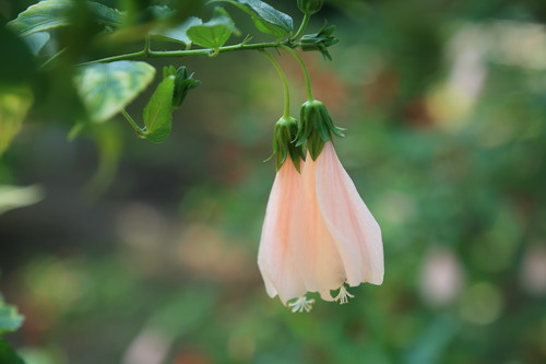 虽有着艳丽的花色,却始终低头含羞,像少女紧裹红袍低头沉思,姿态优美引人遐想。她就是我们今天要介绍的主角,被称为“永不开放的花”——垂花悬铃花。