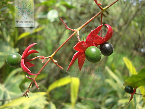 垂茉莉(Clerodendrum wallichii Merr.),又名垂枝茉莉、黑叶龙吐珠,马鞭草科(Verbenaceae)常绿灌木,高可达1-2米,小枝四棱形或呈翅状。叶对生,披针形。聚伞花序排列成圆锥状,下垂。花冠白色,花瓣5枚,雄蕊及花柱伸出花冠,花丝在花后旋卷,花朵形似白蝴蝶。枝条纤细,花姿飘逸,盛开时花香扑鼻,故名垂(枝)茉莉。花期为秋天10月至第二年春天4月,果期为春夏之际。果成熟时,花蕚增大增厚,由鲜红色转为紫红色,衬托着小巧玲珑果实。球形核果,初时黄绿色,成熟后光亮紫黑色,倒挂,故有“黑叶龙吐珠”之称。
