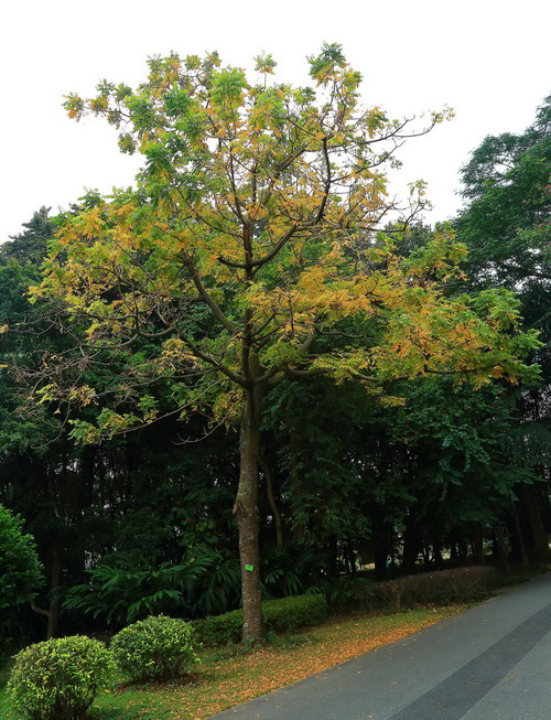 而加椰芒(Spondias cythera)的树叶已经变黄了,满树金黄,在阳光的照耀下异常璀璨夺目。