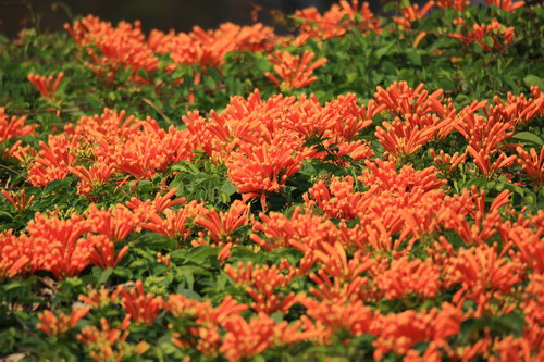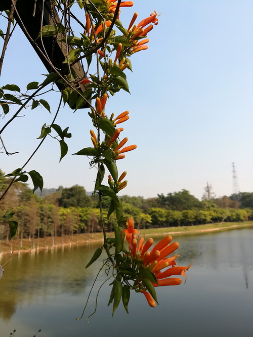 春未到,花已开,目前华南植物园炮仗花正浓烈绽放,以席卷的姿态捎来春的讯息。炮仗花(Pyrostegia venusta (Ker-Gawl.) Miers),又名黄金珊瑚、黄鳝藤,紫葳科(Bignoniaceae)炮仗藤属,二歧状复叶对生,小叶片卵形,顶端长渐尖,两面无毛,背面具细而分散的腺穴,圆锥花序生于侧枝的顶端,长约10-12厘米。花萼钟状,小齿5,花冠筒状,内面中部有毛环,基部缢缩,橙红色,裂片5,长椭圆形,花蕾时镊合状排列,花后反折,边缘有被白色柔毛,雄蕊着生花冠筒中部,花丝丝状,花药叉开,子房密被柔毛,花柱细,柱头舌状扁平,花柱与花丝均伸出花冠筒,连串着生,垂挂树头,状如鞭炮。