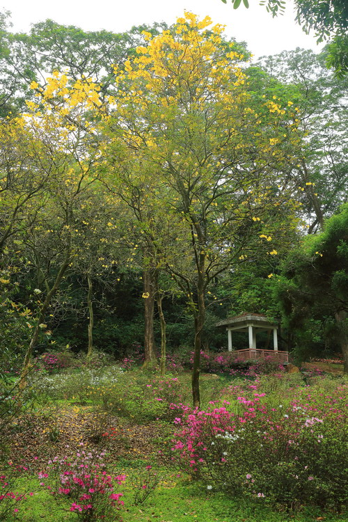 黄花风铃木在广东一般于34月开花,花期半个月左右。2018年的春天来得仿佛格外早,华南植物园黄花风铃木比旧年提早一周开花。植物开花与光照、温度、养护等有关,早点晚点一般也属正常。笔者1月下旬在广州某疾驰的公路旁曾与一株独秀的黄花风铃木花儿擦肩而过,因没有仔细观赏这棵“猴急”的树而懊恼不已。可春节后的朋友圈就被这货刷了屏,华南植物园的黄花风铃木也于近日进入盛花期。记住了,这次可不要错过了,错过了可得再等一年了。