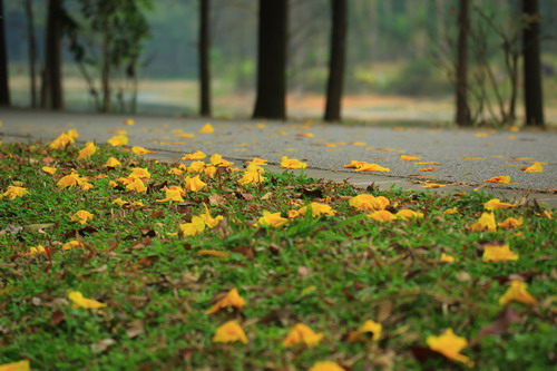 黄花风铃木是先花后叶植物,四季变化明显。春天开花时或树枝光秃秃或稀疏叶片,一树繁花,花儿密集,花团锦簇,分外妖娆;夏天萌生的嫩芽满枝桠,接着是翅果纷飞;秋天枝叶繁茂,葱葱郁郁的绿色;冬天枝枯叶落,满是沧桑, 春华、夏实、秋绿、冬枯,赋予季节以色彩。在我国北方落叶乔木一般是秋冬落叶,春天长新叶,而在南方往往是一边落叶一边吐绿一边吐蕊。据观察,黄花风铃木越是一叶不剩,越是花开灿烂。想想也有道理,正如人的精力有限,树也一样,越是心无旁骛,越是绚烂,大约这也是大自然恒久不变的规律。