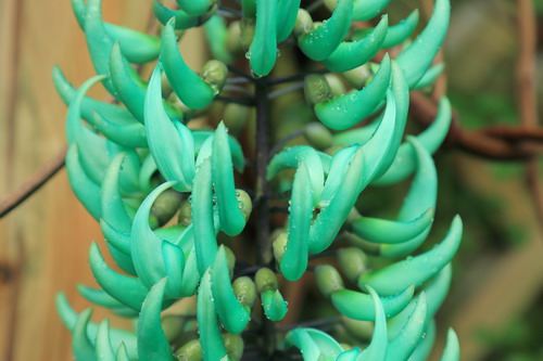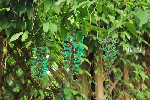 翡翠葛(Strongylodon macrobotrys A. Gray)又名碧玉藤,豆科碧玉藤属木质藤本,来自菲律宾。其花朵沿着花梗呈平展状生长,每一串花有数十朵,每一朵盛开的花像是一只翡翠雕琢而成的小鸟。花碧玉色透蓝色光泽,在阳光的照耀下,如翡翠般晶莹剔透,含苞的酷似翡翠象牙,盛开的如同翡翠雕琢而成的金刚鹦鹉的喙,弯弯上翘的龙骨瓣甚为张扬。