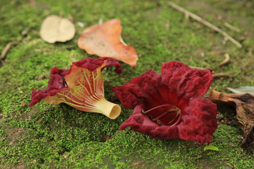 4月中旬的一天午后时分,微雨中信步来到华南植物园中心大草坪,在办公楼和贵宾手植树区交界处,满地硕大深红花朵,抬头发现是枝叶匝密的吊瓜树。在别处见过挂果的吊瓜树,但花却是第一次见到。眼睛有福了,草地上、树周边,美且硕大的红花目不暇接,那天顾着观赏、拾捡,忘了给树为花拍一张照片。