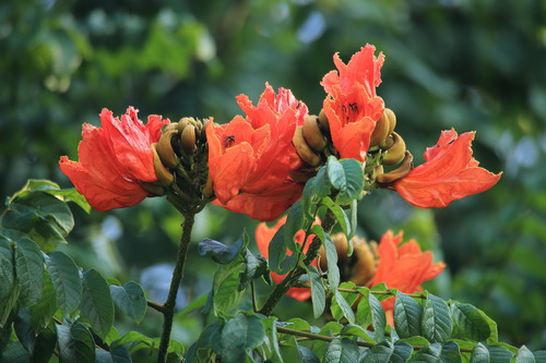 火焰木(Spathodea campanulata)又称火焰树,和前段时间介绍的吊瓜树、蓝花楹一样,同属于紫葳科,属名Spathodea 来自于希腊文spathe(意为佛焰苞的),形容它的花萼如佛焰苞状,种加词campanulata(意为钟状的),描述它的花为钟形。紫葳科主要分布在热带美洲,然而火焰木所在的火焰木属却是非洲特有属,且是单种属,所谓单种属就是属下面仅有一个种。